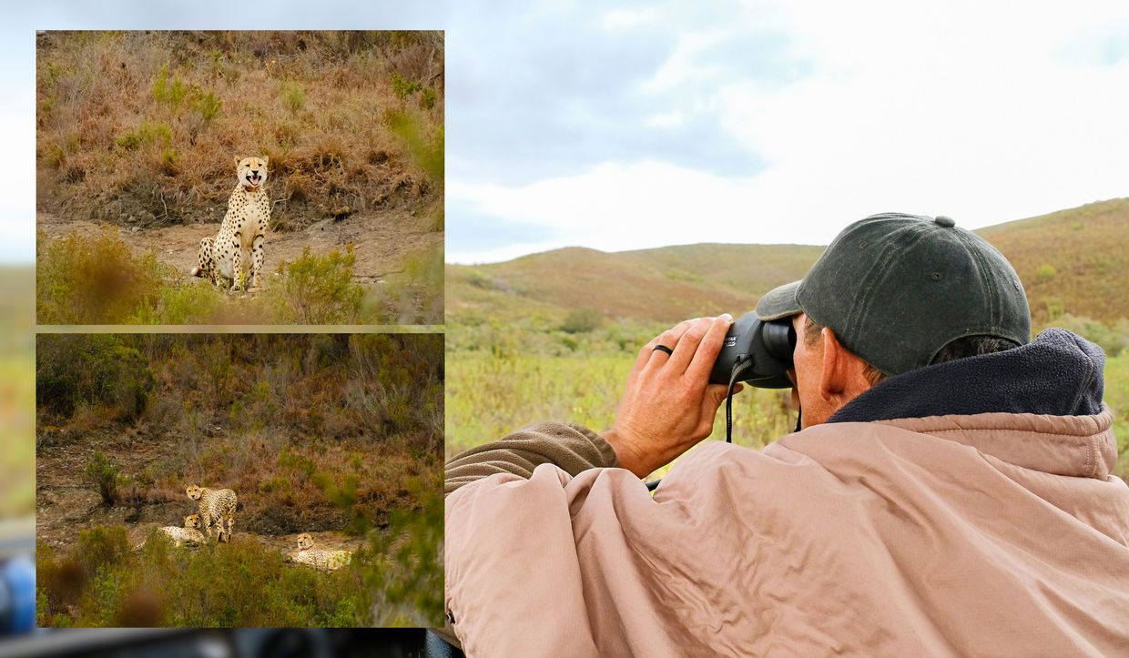 Efter lunch (som återigen var otrolig) gav vi oss ut på ytterligare en eftermiddagstur, den här gången med ett uppdrag: hitta geparderna. Vi såg giraffer, antiloper, fåglar, fler antiloper, fler fåglar… och så småningom började vi alla tänka att det kanske inte var rätt dag idag. Men sedan såg vi dem! Tre geparder, som satt långt borta men fortfarande väldigt synliga, och de hade precis ätit middag. Visste du att geparder faktiskt är de enda stora kattdjuren som inte ryter? Istället kommunicerar de med högfrekventa kvittrande ljud, nästan som fåglar. Det är så de kallar sina syskon eller sin mamma i det vilda, och vi fick till och med äran att få höra de 'kvittra’ till varandra, så coolt. En annan rolig sak är att geparder är byggda för fart, inte styrka, så de har superlätta kroppar och till och med tårspår under ögonen (de svarta linjerna) som fungerar som naturliga solglasögon för att hjälpa dem att fokusera när de springer. Hur som helst, efter gepardarna stannade vi för en drink mitt i en dal, omgiven av berg och sedan åkte vi tillbaka till lodged för middag som återigen var fantastisk.