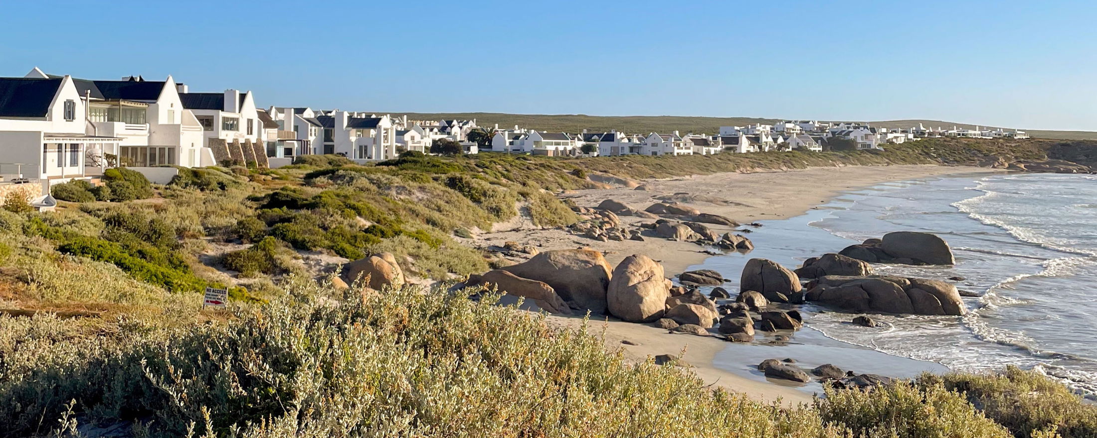 I Paternoster bodde vi på Gonana Guesthouse, som Jonas byggde, designade och skapade. (Jag vet, ganska imponerande.) Det är det första hållbara gästhuset i området, helt miljövänligt och bokstavligen precis vid stranden. Låter som drömmen, eller hur? Rummen har utsikt mot havet, och hela platsen är lugn och naturlig, som om den är en del av landskapet snarare än bara placerad på det. När vi kom fram tog jag en lång strandpromenad, njöt av vinden, och sedan åt vi middag på Voorstrandt, en strandrestaurang inredd i ett rött och grönt plåthus, det enda huset i området som inte är vitmålat.