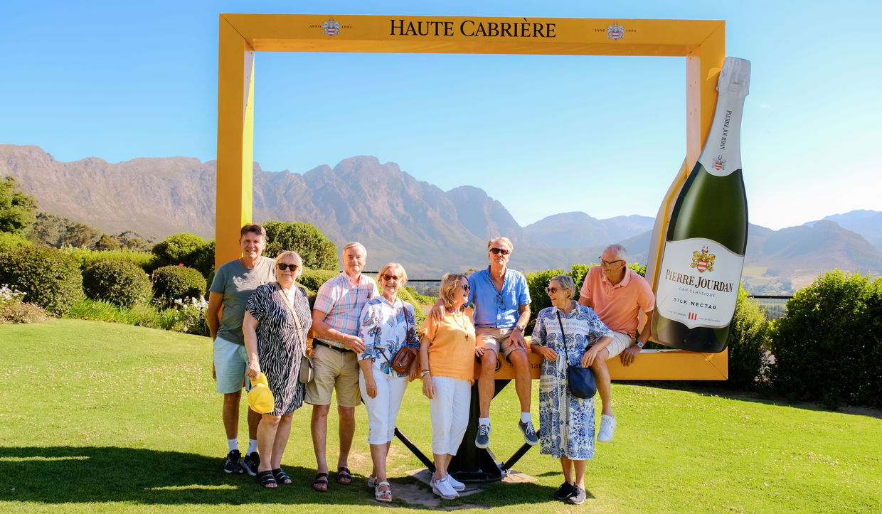 Nästa morgon besökte vi Boschendal, en av de äldsta vingårdarna i landet. Förutom att göra fantastiskt vin, är gården känd för sina bergsutsikter, trädgårdar och gård-till-bord-filosofi. Vi hade en vinprovning och hade sedan en picknicklunch under träden. Vår vinresa fortsatte till Haute Cabrière i Franschhoek, där de gör något som heter Cap Classique, vilket är Sydafrikas version av champagne. Gården ligger på en sluttning med en otrolig utsikt över dalen, och dess vinkällare är inbyggd i berget.