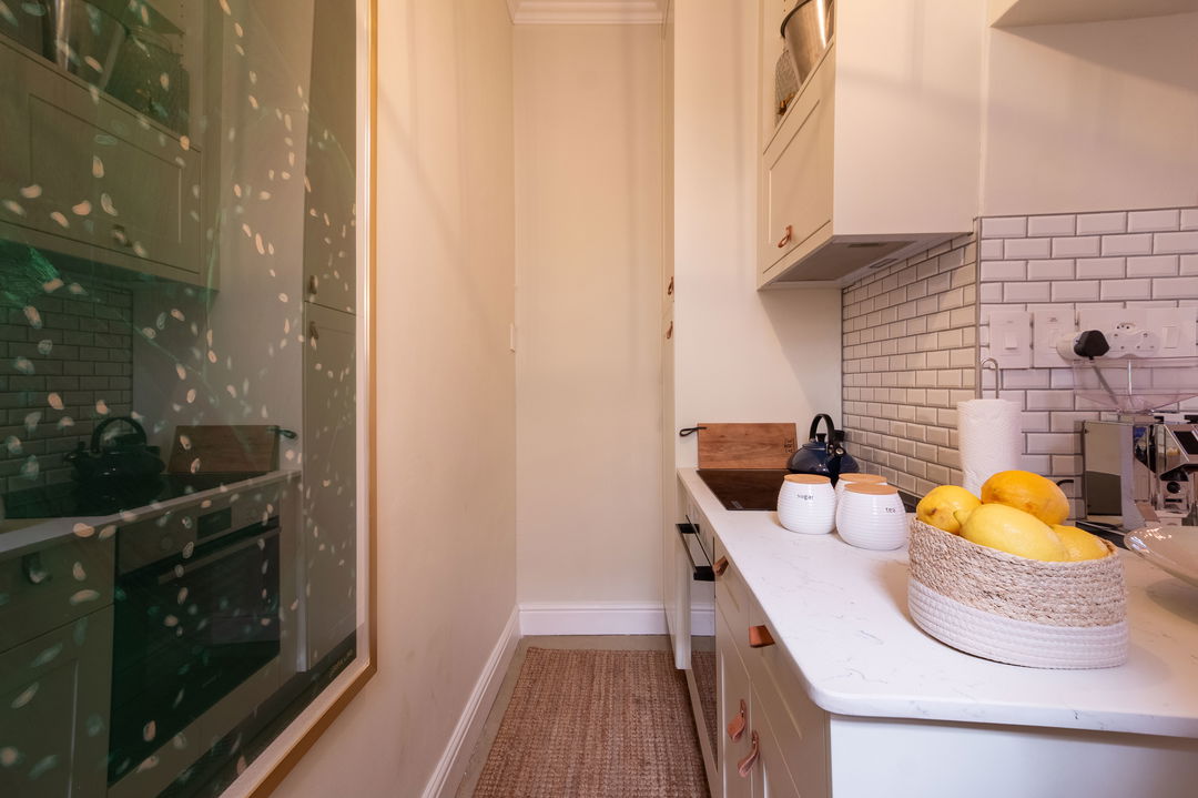 - Ett kompakt men välutrustat kök i skandinavisk stil (induktionshäll, ugn, halvhög kyl med frys)